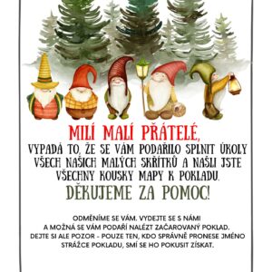 - Dětem postupně představíte 5 karet se skřítky, splníte s nimi 5 skřítčích úkolů a najdete 5 kousků mapy, do které jste před rozstříháním zakreslili trasu k pokladu. Jde o úkoly hledací, které zvládnou i nejmenší děti.
