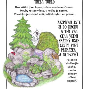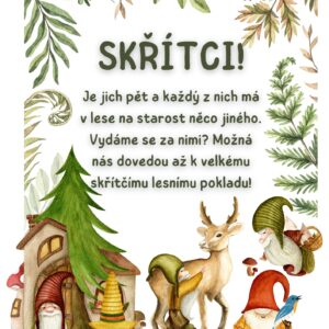 Vypadá to, že v lese přímo za naší chalupou se objevilo hejno skřítků. A nejsou to skřítci jen tak ledajací. Jsou to skřítci zodpovědní, velice starostliví a přírody znalí. Jen každý z nich se momentálně ocitl ve velmi nešťastné situaci. S problémem si neví rady a je třeba jim pomoct. Najdou se snad děti, které by skřítkům rády pomohly? Skřítci by jim určitě velmi upřímně poděkovali a snad je i lesním pokladem odměnili.